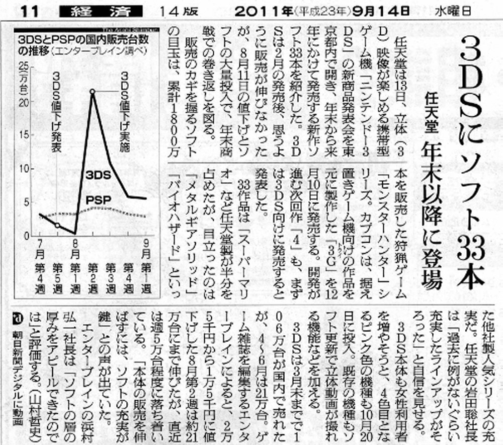 ただ、遅すぎるようにも思いますが、ようやくこの点の反省に立って、任天堂はサードパーティを援助し始めたのかなと思うことも本日ありましたね。wiiのみんなのニンテンドーチャンネルが、ただいま現在、凄いことになっています。任天堂3DSカンファレンス特集で、wiiみんなのニンテンドーチャンネルのほぼ全てのチャンネルが、3DSカンファレンスや、サードパーティゲームの紹介になっています。任天堂が行っているwiiを使った視聴無料のゲームチャンネル(ゲーム紹介のチャンネル)であるみんなのニンテンドーチャンネルは、サードパーティの作品のチャンネルを出すには任天堂に払う広告費用が掛かるらしく、サードパーティはニンテンドーチャンネルに作品を出しづらいと聞きますが、今回はこれだけの会社が一気にチャンネルに出ているということは、任天堂が無料で3DSサードパーティに対してチャンネルを開放したのでしょうね。新聞などにも出ていますが(下記新聞記事参照、画像クリックすると拡大します)、任天堂が自社開発のみを重視する殿様商売を止めてサードパーティを重視して援助する方向に向かうのは、ゲーム業界にとってとても良いことだと思います。