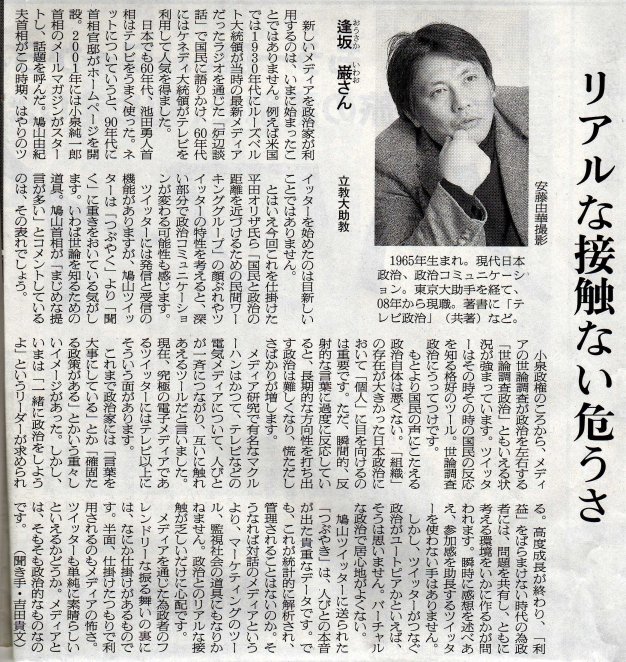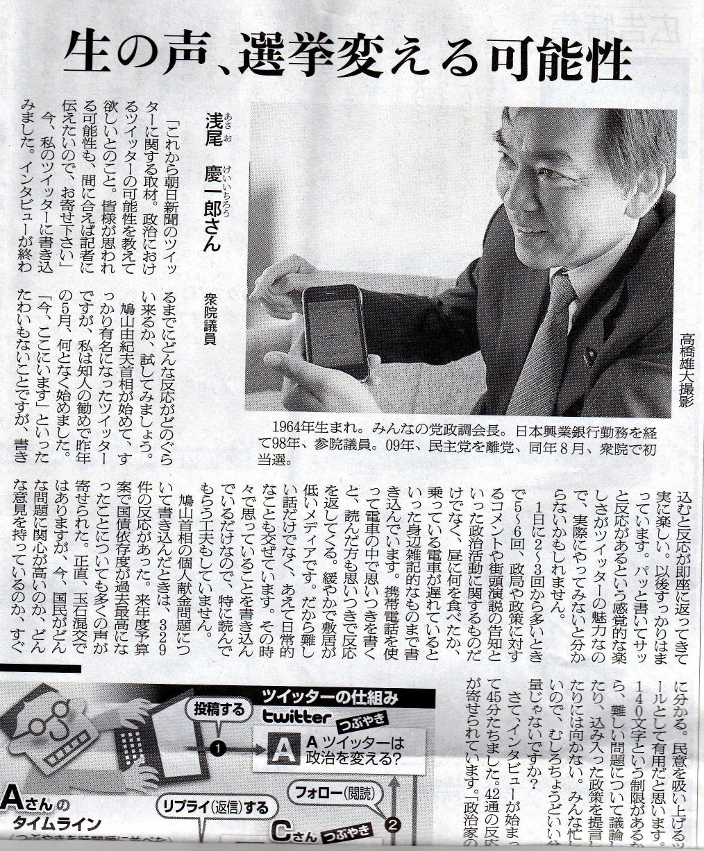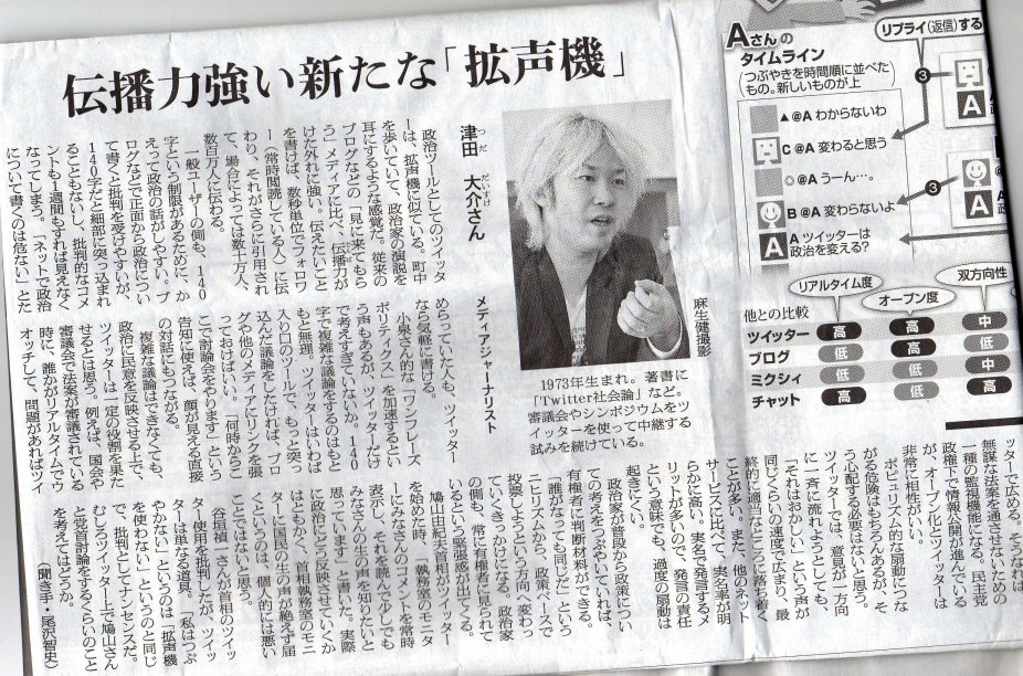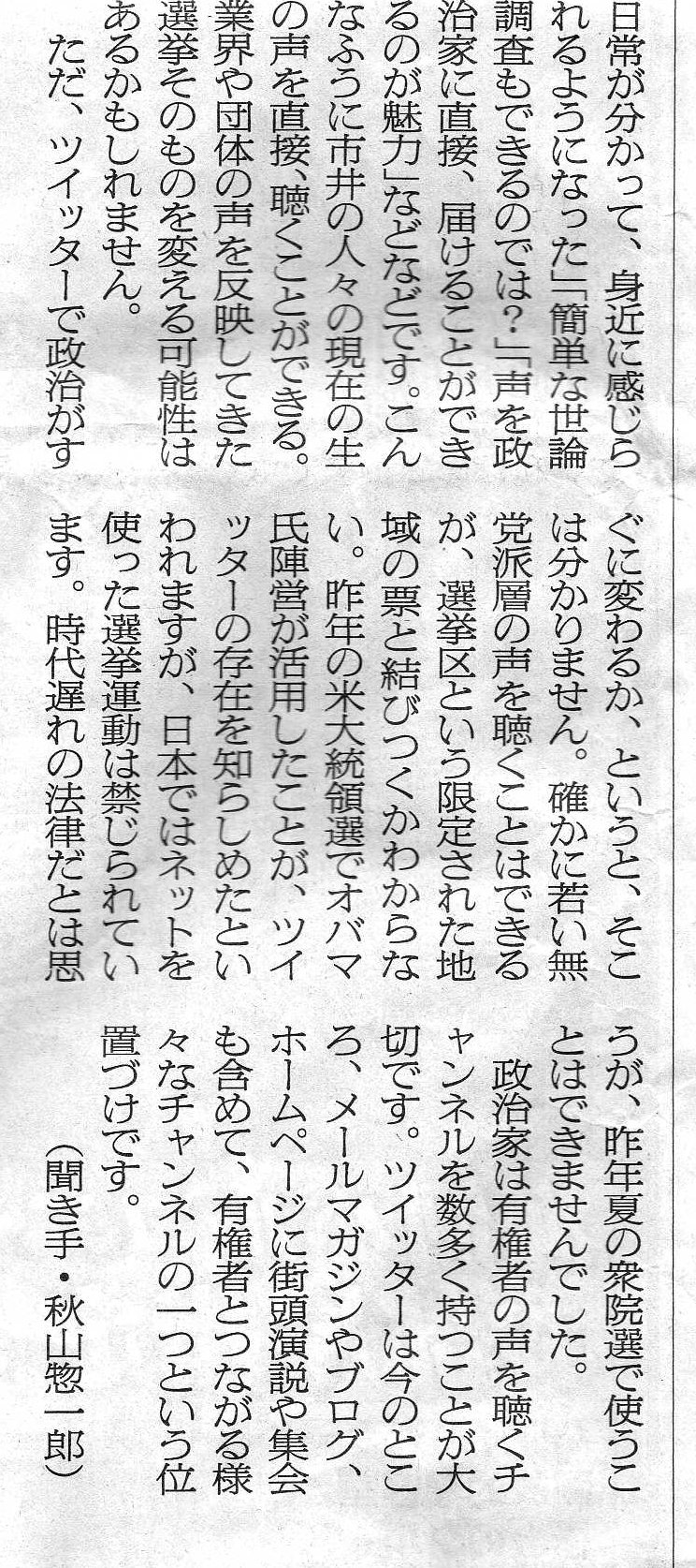 政治家が普段から政策についての考えをつぶやいていれば、有権者に判断材料ができる。(中略)谷垣禎一さんが首相のツイッター使用を批判したが、ツイッターは単なる道具。「私はつぶやかない」というのは、「拡声器を使わない」というのを同じで、批判としてナンセンスだ。むしろツイッター上で鳩山さんと党首討論をするくらいのことを考えてはどうか。