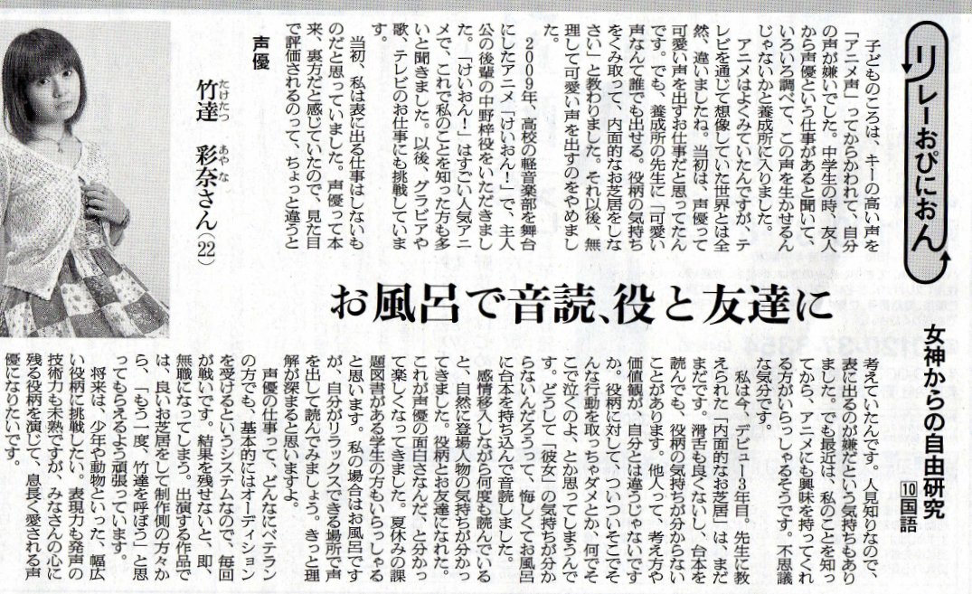 今日の朝日新聞、竹達彩奈さんのインタビューが載っていますね。全文ネットで読むことも可能です。新聞紙面インタビューの方もスキャンしましたのでよろしければどうぞ〜。